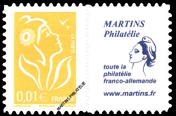 Marianne de Lamouche : 0.01 € yellow, self-adhesive stamp with varnish cover, signature 'phil@poste' and with publicity label, offset printed (photo label not contractual)