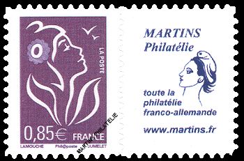 Marianne de Lamouche : 0.85 € purple,self-adhesive stamp with varnish cover, signature 'phil@poste' and with publicity label, offset printed (photo label not contractual)