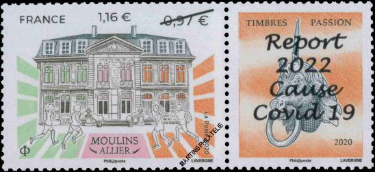 Tourism : Moulins (Allier) - 0.97 €, stamp with label and overprint "Report 2022 Cause Covid 19"